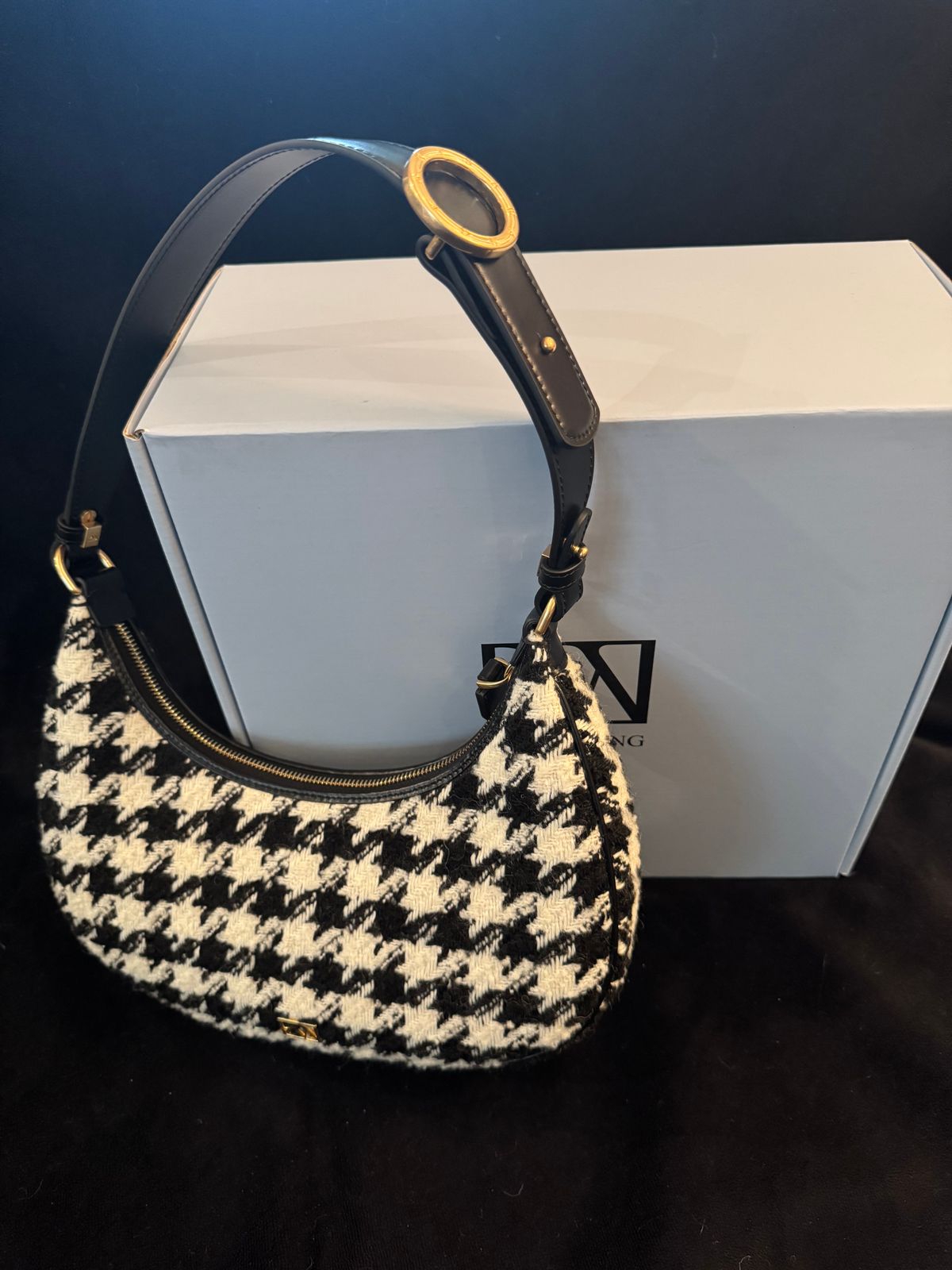 I purchased this bag in the black and white houndstooth. I LOVE IT! It’s simply adorable, it’s a perfect practical size; large enough to carry the essentials and small enough to be easily manageable. I debated for awhile before ordering, but am so glad I did. The enlarged houndstooth pattern is classic, yet fun and will add an interesting twist to any black outfit. The bag is beautifully made and has top notch hardware. I couldn’t be happier with this addition to my handbag collection. Thank you Parisa Wang.